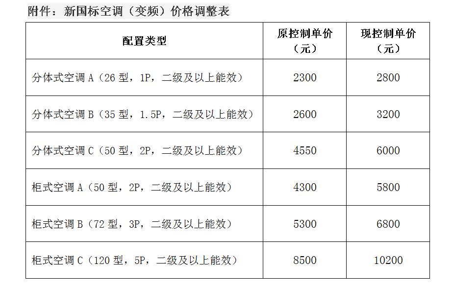 学校现行的《通用办公设备配置标准》中空调设备配置标准、控制单价是依据原国家标准参考市场招投标价制定的,现根据新的国家标准和政府采购节能环保相关政策规定,对空调设备配置标准的控制单价参考目前市场招投标价进行调整(详见附件:新国标空调(变频)价格调整表)。