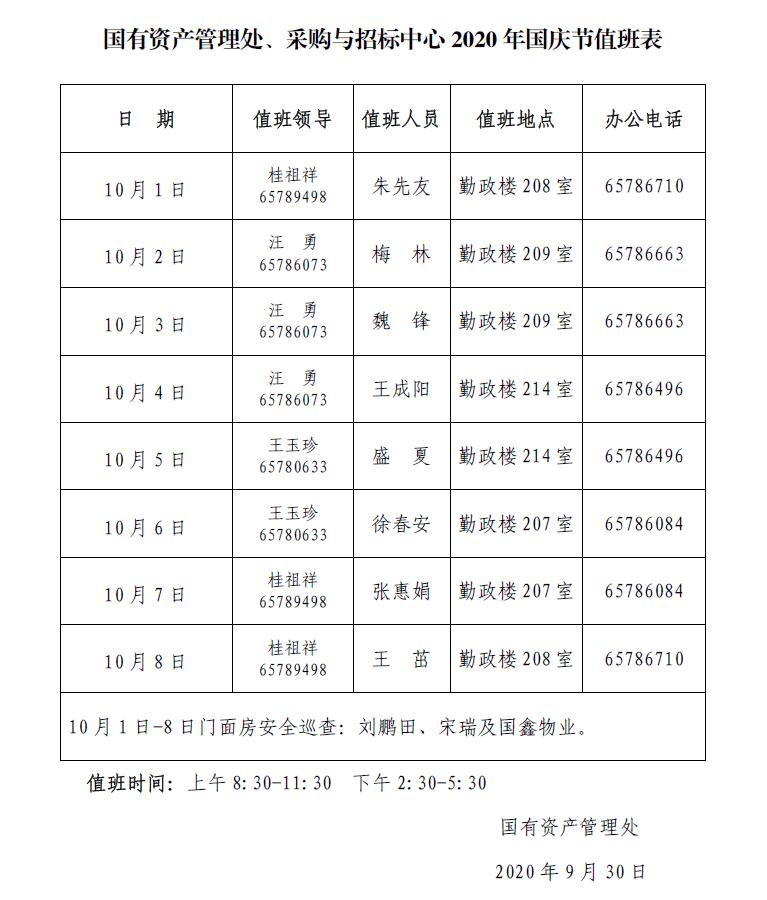 国有资产管理处、采购与招标中心2020年国庆节值班表