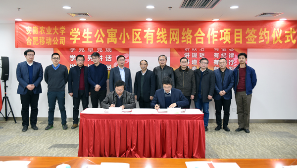 国资处处长桂祖祥与合肥移动公司副总经理王伟代表双方在协议上签字。根据协议规定,合肥移动将出资1050万元,与我校合作建设学生公寓小区有线网络。我校国资处、图书馆、现代教育信息中心、学生公寓小区等单位负责人参加了签约仪式。