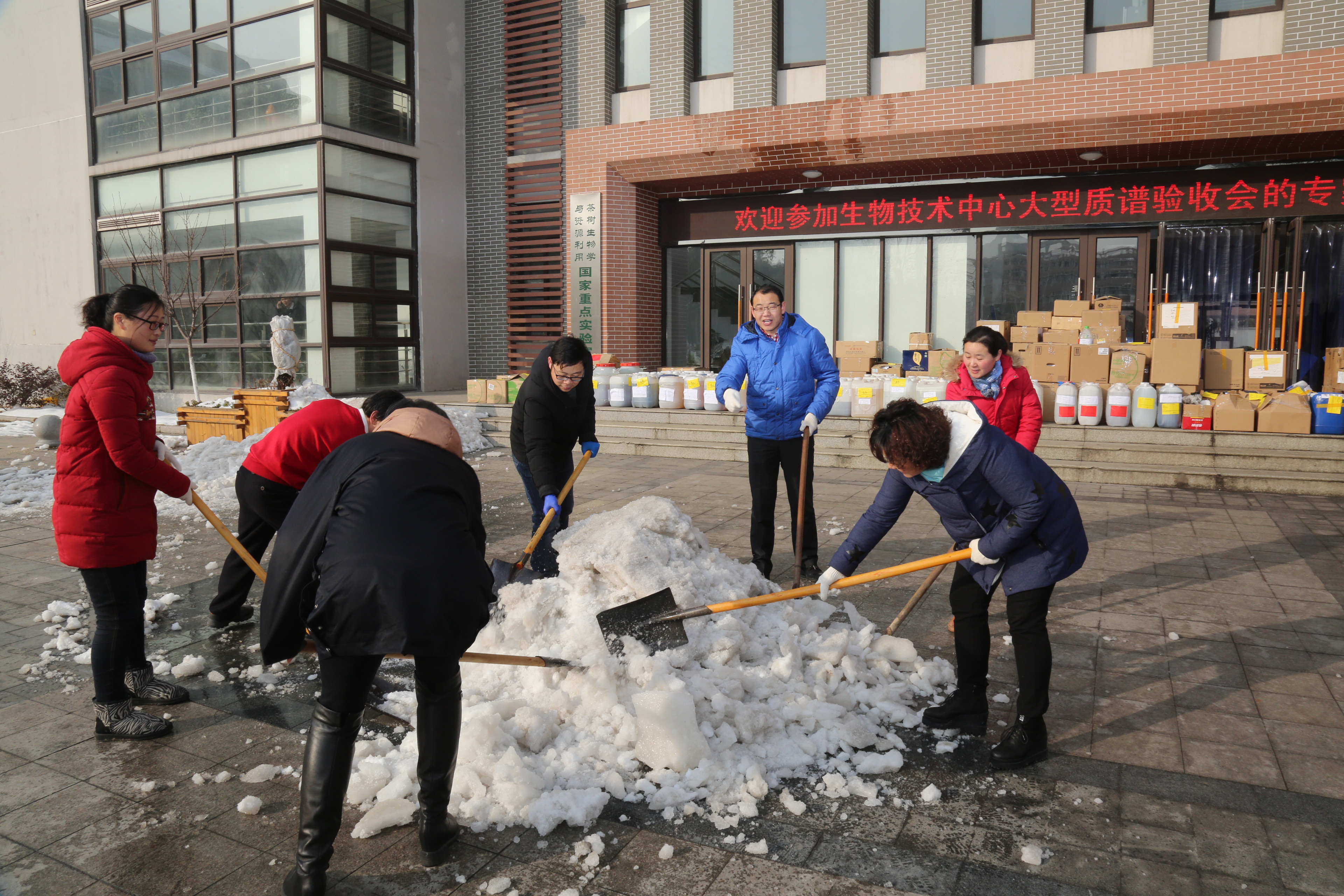 生物技术中心副主任叶辉带领老师为转运车辆进场清扫雪堆