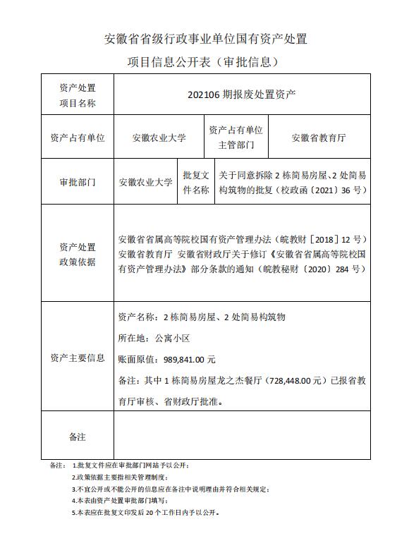 国有资产处置项目(202106期)审批信息公开
