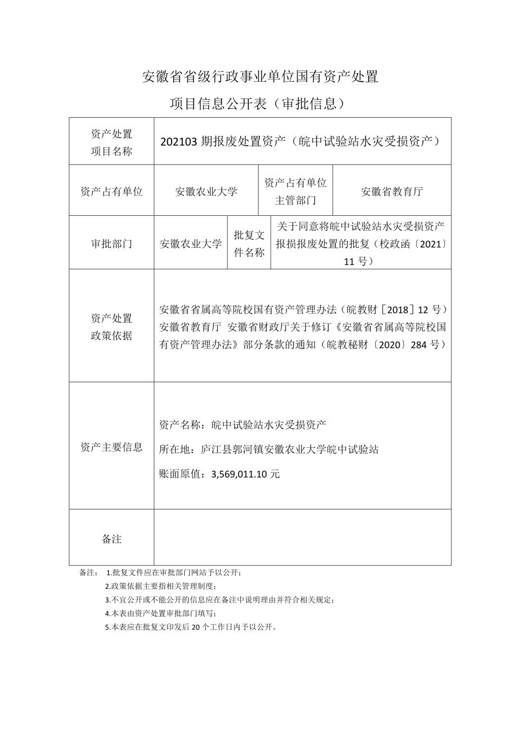 国有资产处置项目(202103期)审批信息公开