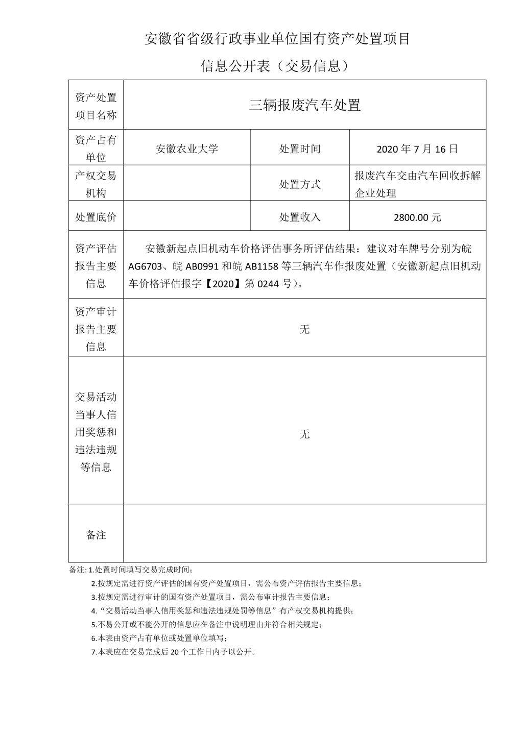 国有资产处置项目(三辆报废汽车)交易信息公开