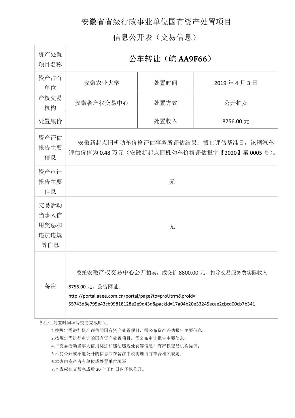国有资产处置项目(皖AA9F66公车转让)交易信息公开