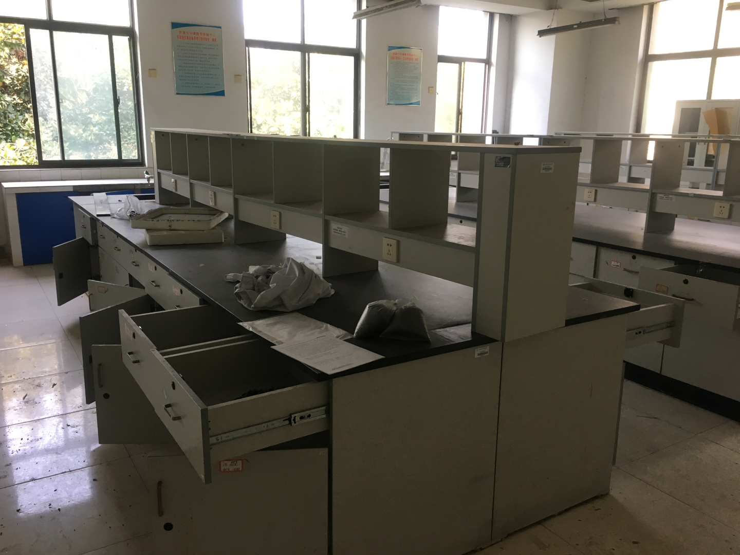 由于中西部大楼实验室统一配置了实验台柜,植物保护学院留在第三教学楼的一批实验台柜状况良好,可以调剂使用。有需要的单位可以到现场查看,并向国资处提出调剂使用申请,联系人:王老师、盛老师,联系电话65786496。现场查看联系人:赵老师,联系电话65786392。